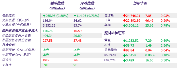 12月26日,昨日行情重现,午盘市场情绪低迷,午后场外资金纷纷流入大盘板助市场打破低迷局面,市场交易活跃度也因此快速上升,越南指数成功收复960点关口。截至收盘,越南指数上涨7.62点,报965.93点,涨幅0.79%,成交量达1.86亿股,成交5.252万亿越盾,外资买卖合计6319.2亿越盾、净流入1767.6亿越盾。河内指数跟涨0.82点,收涨0.73%,报114.06点,成交量5462万股,成交额837.4亿越盾,外资买卖合计583.7亿越盾、净流出165.9亿越盾。