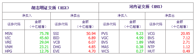 经圣诞节假期后,外国投资者今日加强买入大量蓝筹股。外资净买入总额达1600亿越盾。胡志明市场上,外资买卖合计6319.2亿越盾、净流入1767.6亿越盾。河内市场上,外资买卖合计583.7亿越盾、净流出165.9亿越盾。