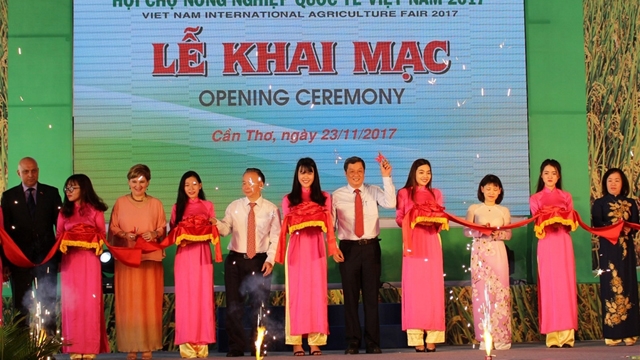 越南芹苴市人委会同工贸部贸易促进局11月23日在芹苴市联合举行2017年越南国际农业展览会开展仪式。