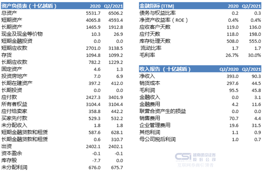 •该公司最近批准了关于转让 大盛发建设投资股份公司所有股份的主张,转让金额不低于投资原价, 这将使公司短期内有利可图。 但资产质量和利润不高(其他应收款继续增至3.536万亿越盾,占总资产的54%,往年利润来自股权转让、项目转让等) 。