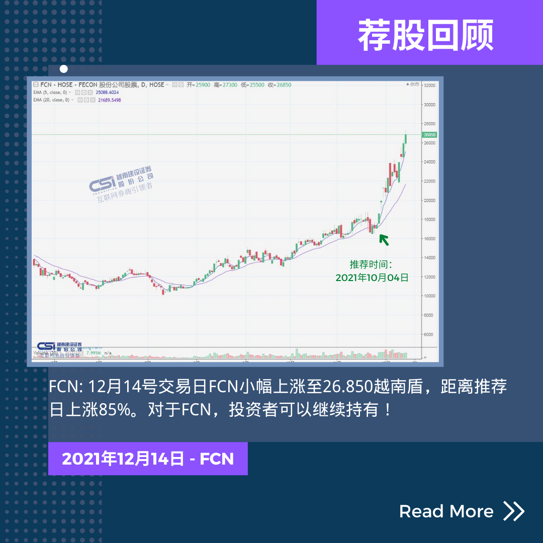 股价变动:12月14号交易日FCN小幅上涨至26.850越南盾,距离推荐日上涨85%。对于FCN,投资者可以继续持有!