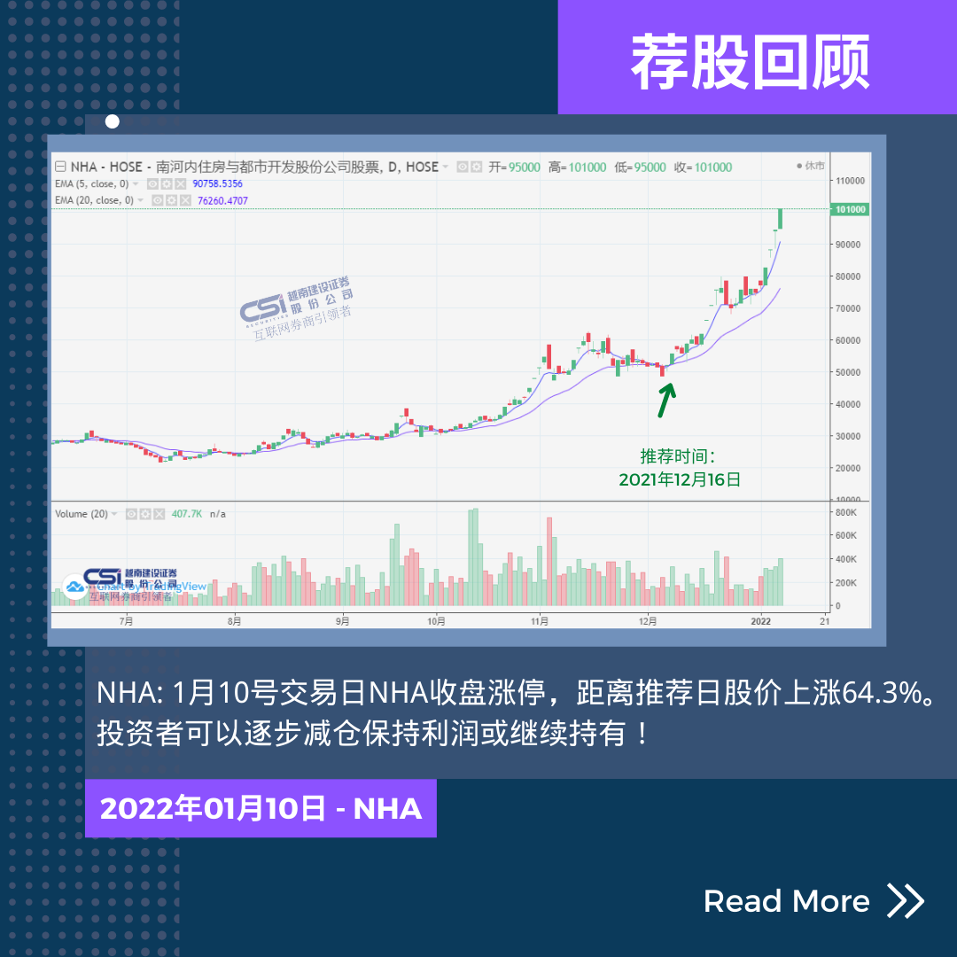 股票价格波动:1月10号交易日NHA收盘涨停,距离推荐日股价上涨64.3%。投资者可以逐步减仓保持利润或继续持有!