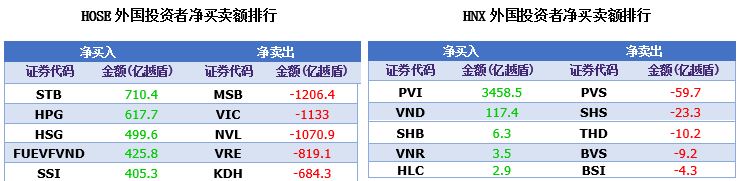 尽管今日越南指数强劲反弹,但成交量却没有跟上,超跌反弹行情并未提振市场情感。胡志明市场的成交额仅为17.88万亿越盾(约50.3亿人民币),成交量为5.686亿股。对于外资方面,外资在胡志明市场的净卖出总额达到3251.7亿越盾(约9147万人民币),而河内市场的净买入总额达到3432.6亿越盾(约9658万人民币)。其中,外资在河内市场的最大一笔交易是PVI-PVI股份公司的大宗交易。
