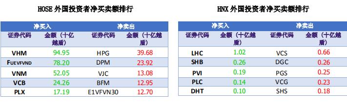 外资表现较佳并重回净买入状态,净买入总额超过1000亿越盾。买盘集中于:VHM(949.5亿越盾)、 FUEVFVND(782亿越盾)、VNM(520亿越盾)、VCB(243亿越盾)。