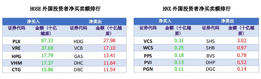 关于上涨方面,VN30成分股中,最值得注意的是HPG上涨2.7%至2.835万越盾/股,成交超过2800万股,SAB上涨2.5%至18.51万越盾/股,CTG上涨1.7%,VRE上涨1.3%,BID上涨1.2%。相反,VPB、MSN、POW、VNM、VIC等股票收跌,但跌幅不是太大。