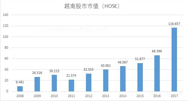 据统计,截止2017年底,越南股市市值约为1166亿美元。