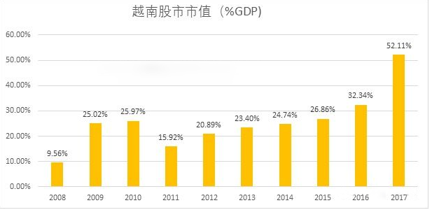 截止2017年底,占GDP比重为52.11%,股神巴菲特说过,当股市市值占GNP(国名生产总值)在70%-80%时,买入该国股票长期来说很有利。虽然最近两年越南股市涨幅很大,但是仍然是长期投资的选择之一。