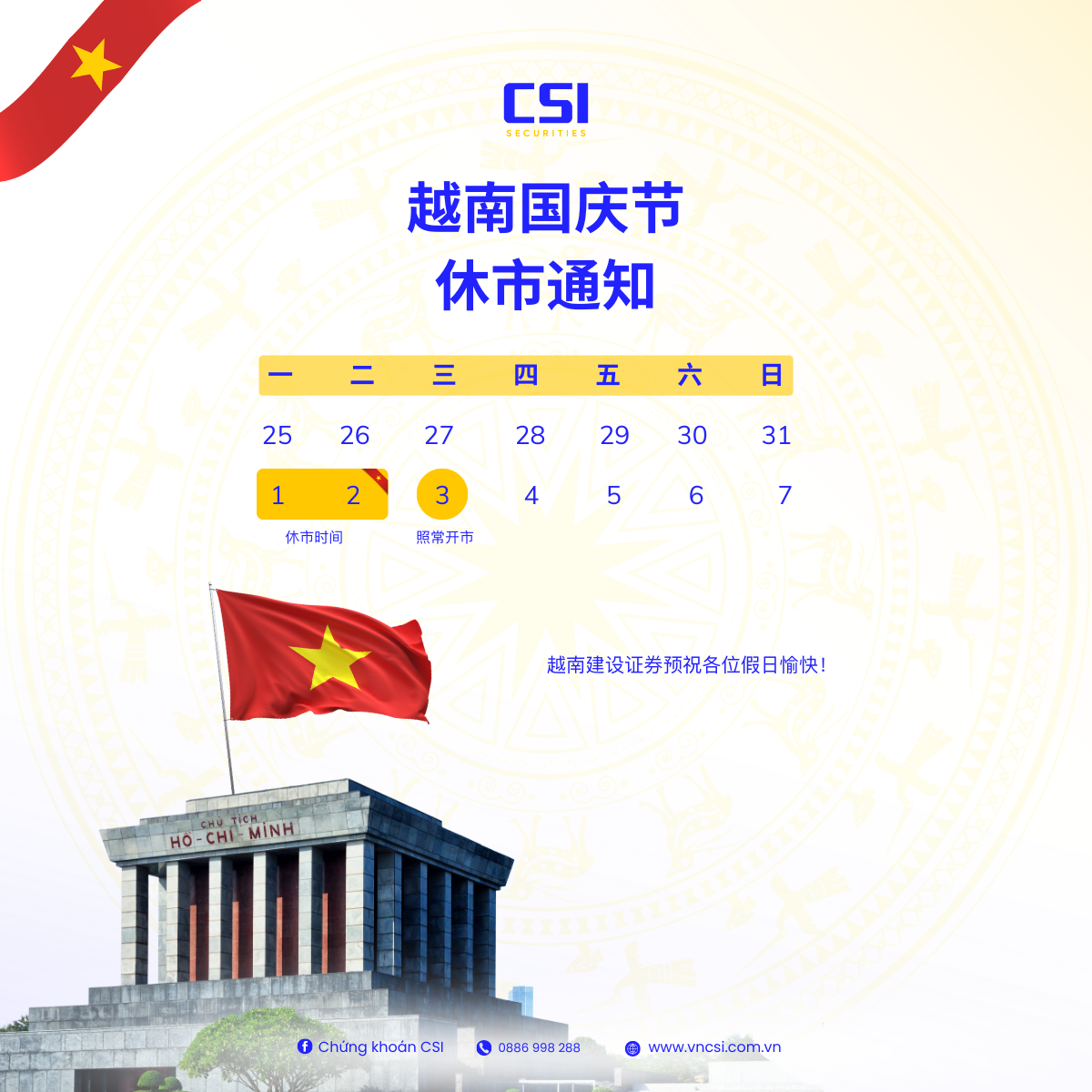 2025年越南国庆节即将来临, 根据胡志明证券交易所和河内证券交易所相关通知,2025年越南证券市场休市安排如下: