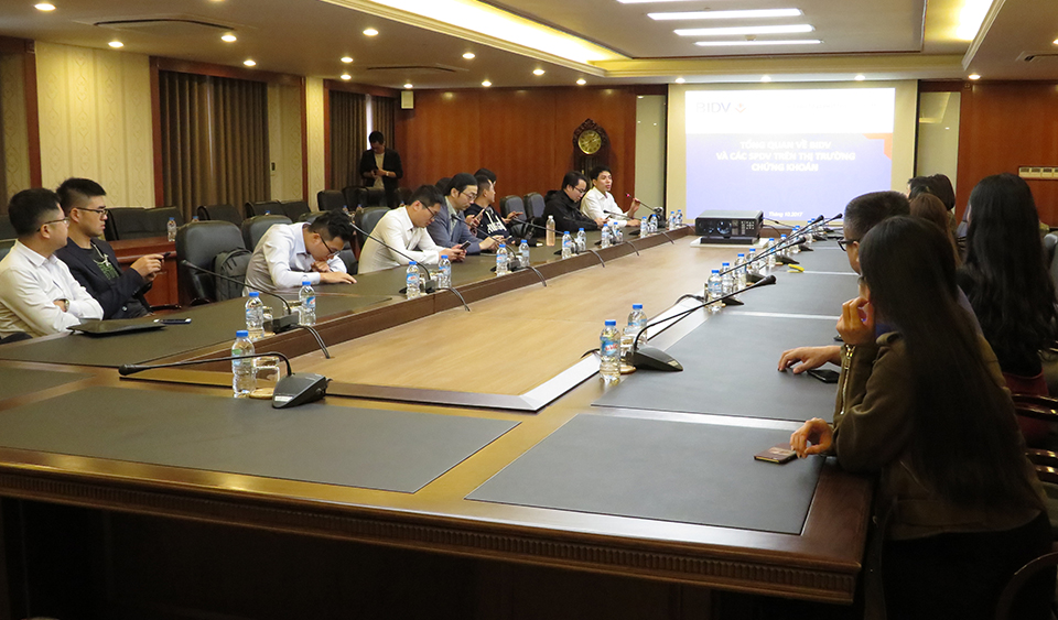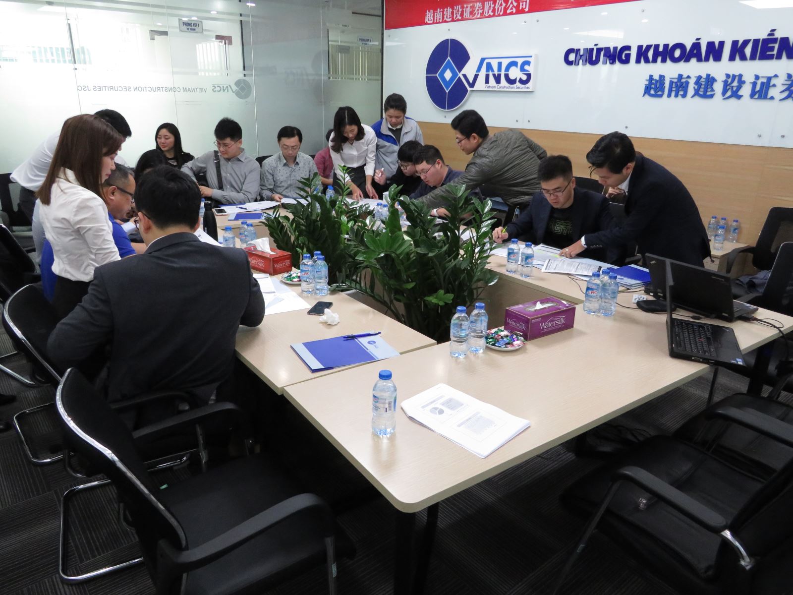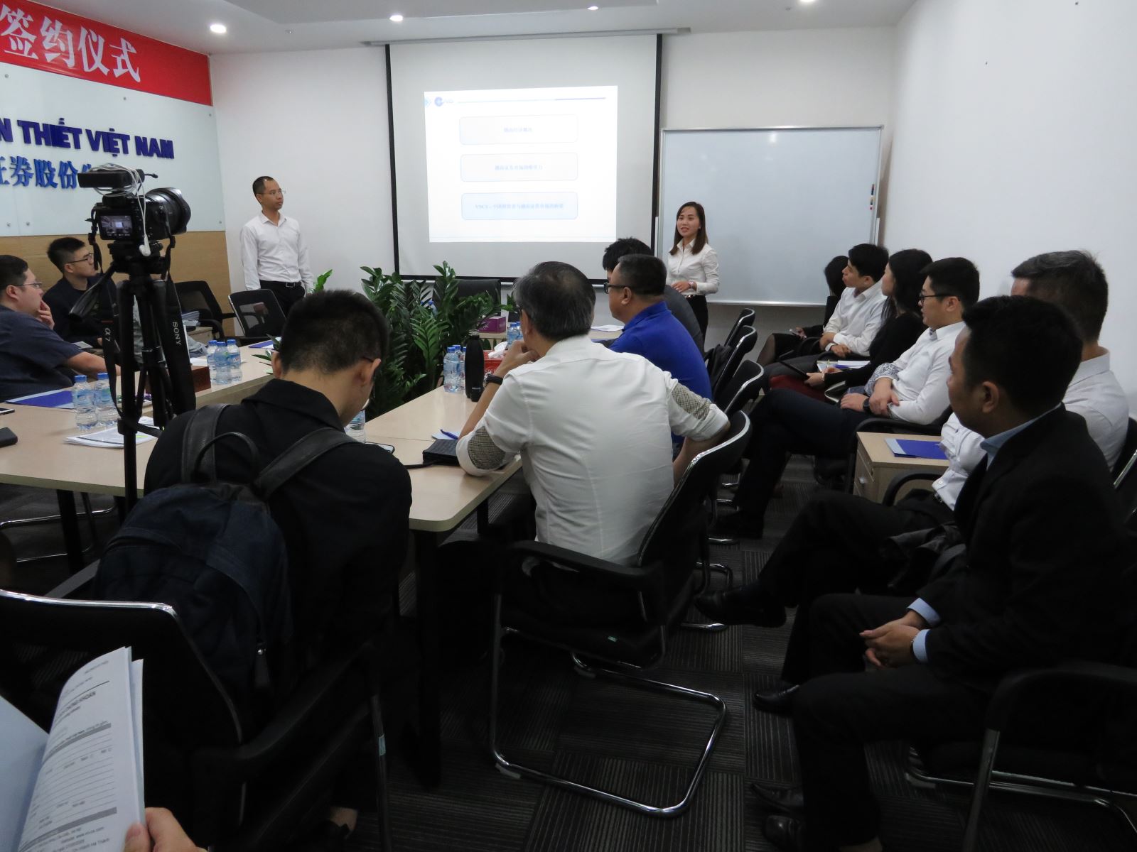 该考察团在前一天去往胡志明市考察房地产市场,第二站即安排到河内考察越南证券市场和投资环境以及投资机会。席间,越南建设证券首席分析师向各位来宾做了关于越南证券投资环境的专题讲解。介绍了越南的政治、经济环境,包括近几年的经济发展情况以及未来的发展方向,还介绍了越南证券市场的具体情况。越南证券市场的潜力引起了在座考察团成员的兴趣,纷纷向分析师提问,一同探讨越南经济、证券等相关问题,现场气氛一度十分热烈。建设证券首席分析师的专业素养、客服人员流利的中文给考察团成员们留下了深刻的印象,纷纷决定在建设证券开户,准备着手投资。
