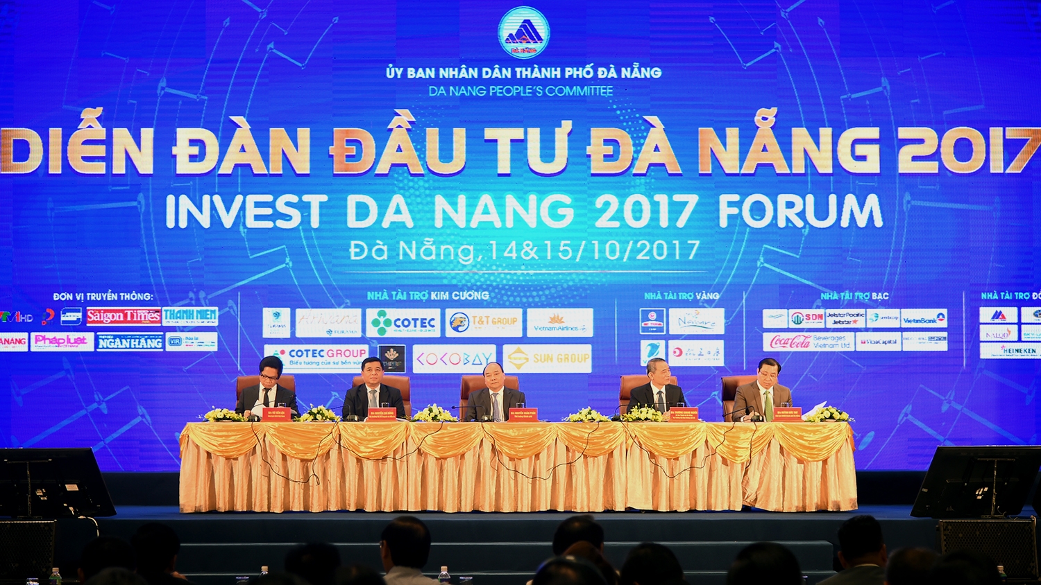 岘港市10月15日在阿丽亚娜国际会议中心举行2017年岘港市投资论坛。越南政府总理阮春福主持论坛。政府领导、中央和地方各部委,外交机构领导代表、各国际组织、企业协会、投资商、国内外企业界等近1000名代表出席论坛。