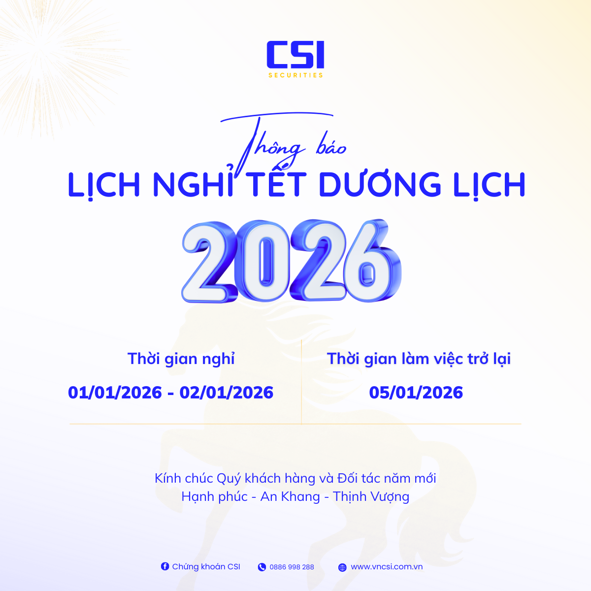 Công ty Cổ phần Chứng Khoán Kiến Thiết Việt Nam (CSI) xin trân trọng thông báo đến Quý khách Lịch nghỉ lễ Tết Dương lịch năm 2026 như sau: